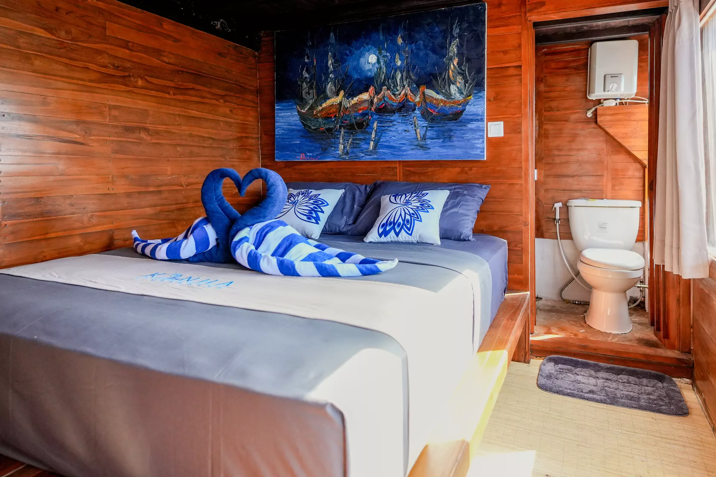 Double Room, CittaShakti and Sedana are twin upper‑deck cabins, each with a queen bed, AC, and an ensuite bathroom. The windows frame the blue water and keep the room bright during the day. If you need space for a third person, the crew can add an extra bed. These are easy cabins for couples who want a quiet spot close to the sundeck.
