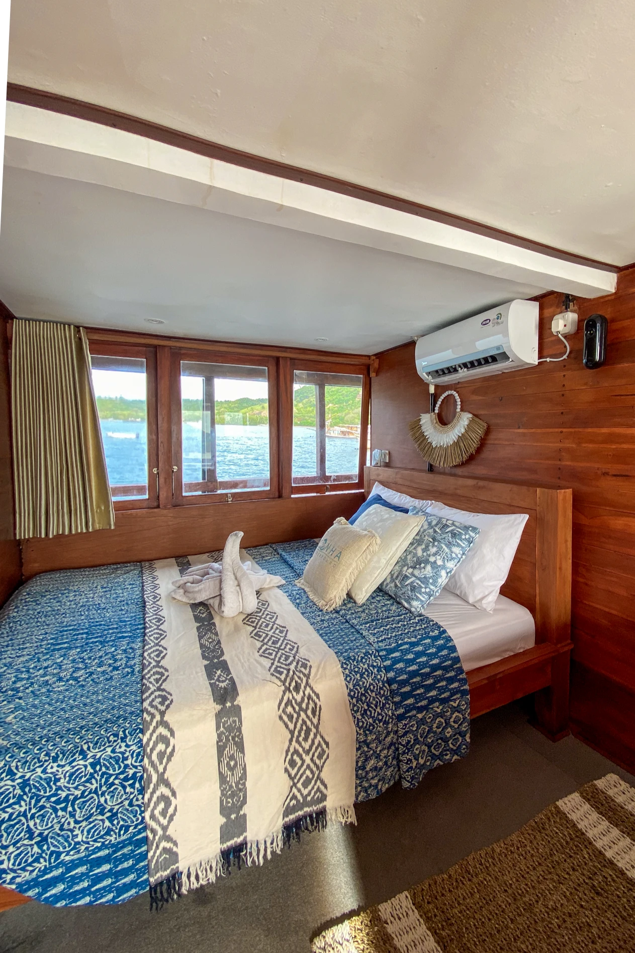 Double Room, LokaShaped for easy comfort, the two Deluxe cabins each include a queen bed, AC, and an ensuite bathroom. Large windows keep the room bright during the day, and the balcony is only a few steps away. If needed, the crew can add an extra bed, which makes these cabins a simple pick for a couple with one child.