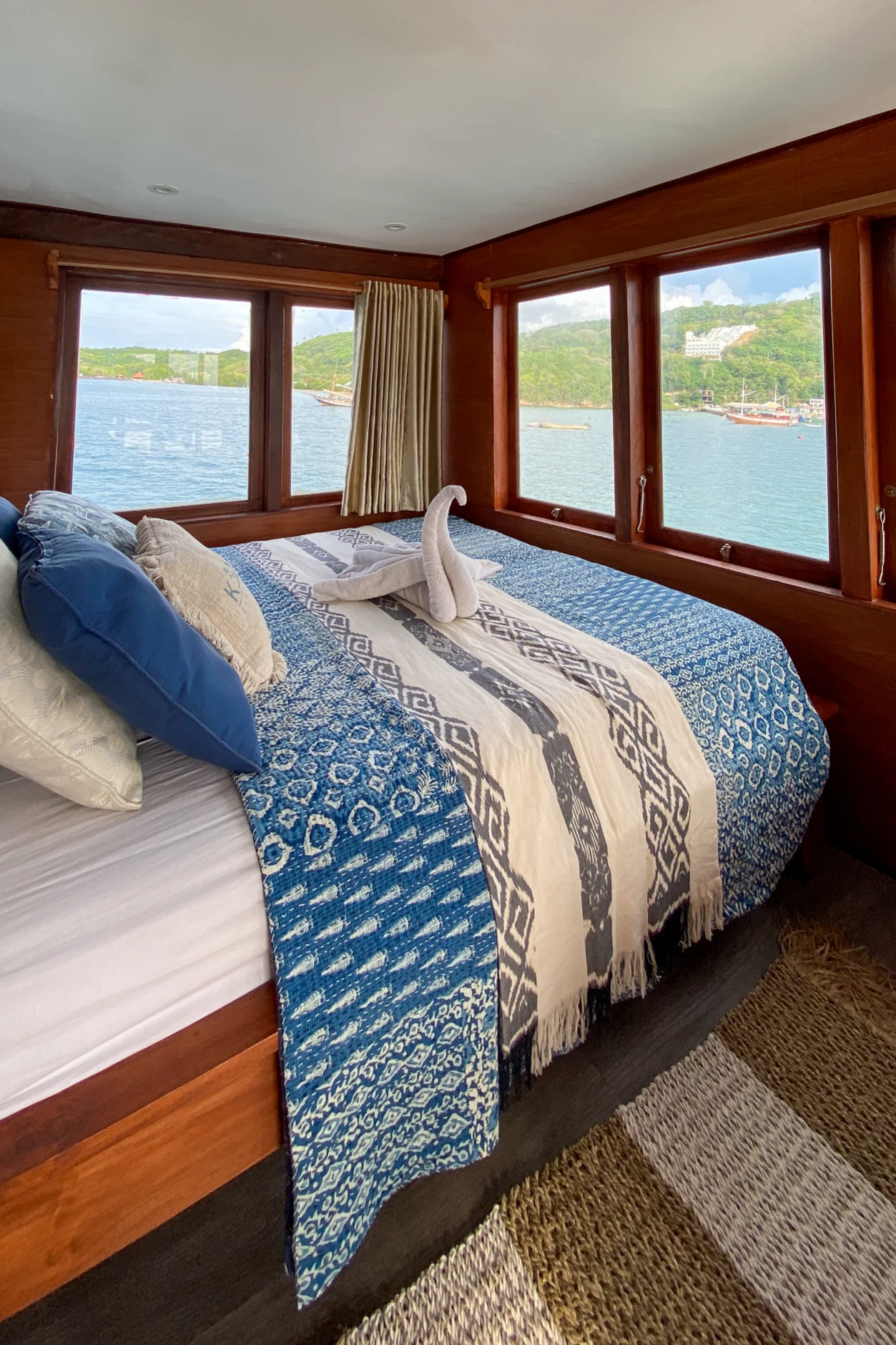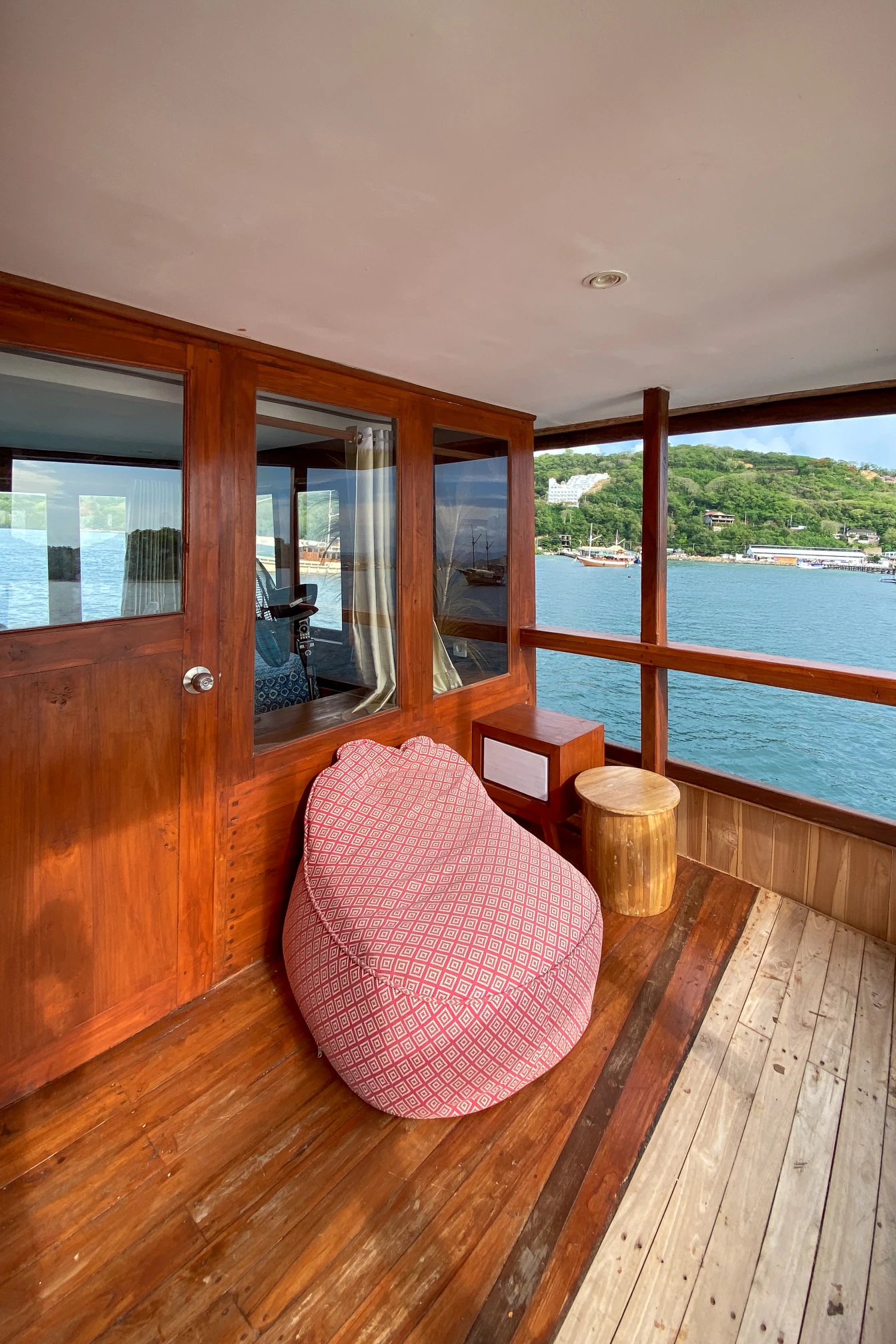 The master sits on the upper deck with a queen bed, AC, and a private bathroom with hot water. You also get balcony access for fresh air and open sea views. An extra bed fits a third guest without crowding the room, so it works well for a couple traveling with a friend or child who wants to stay in the same space.