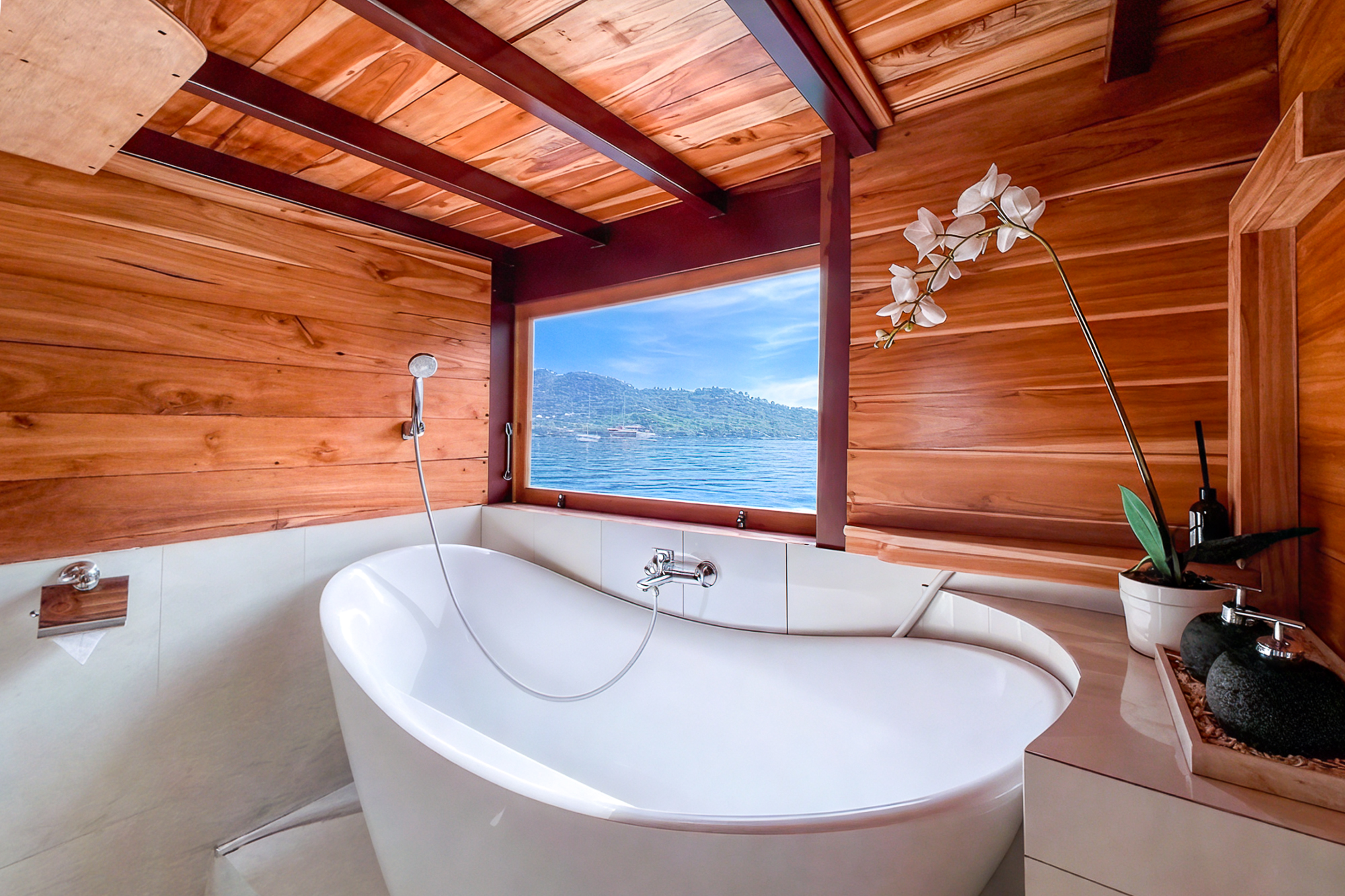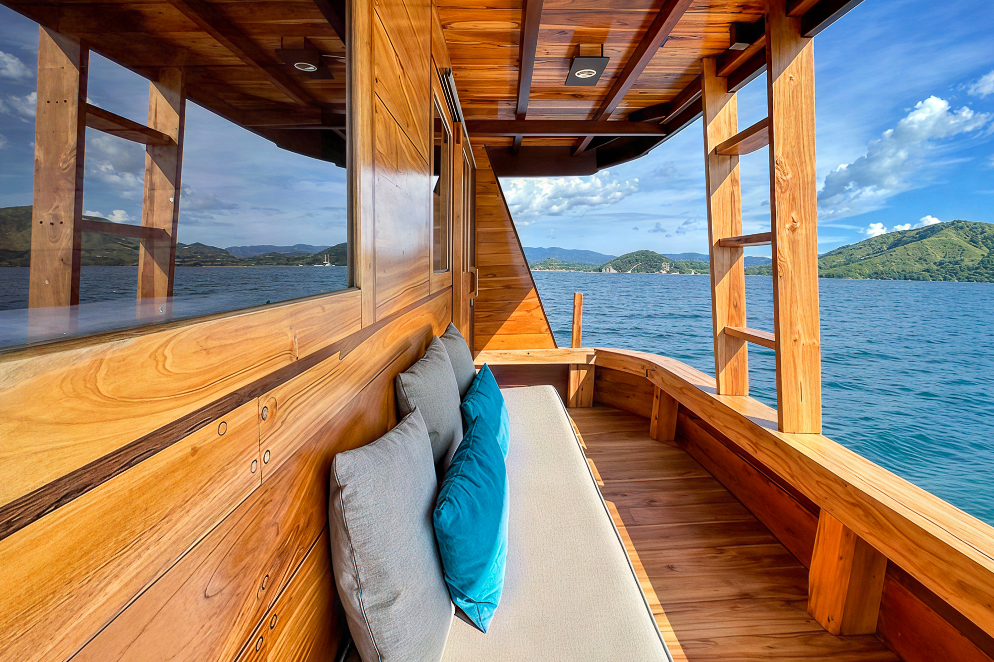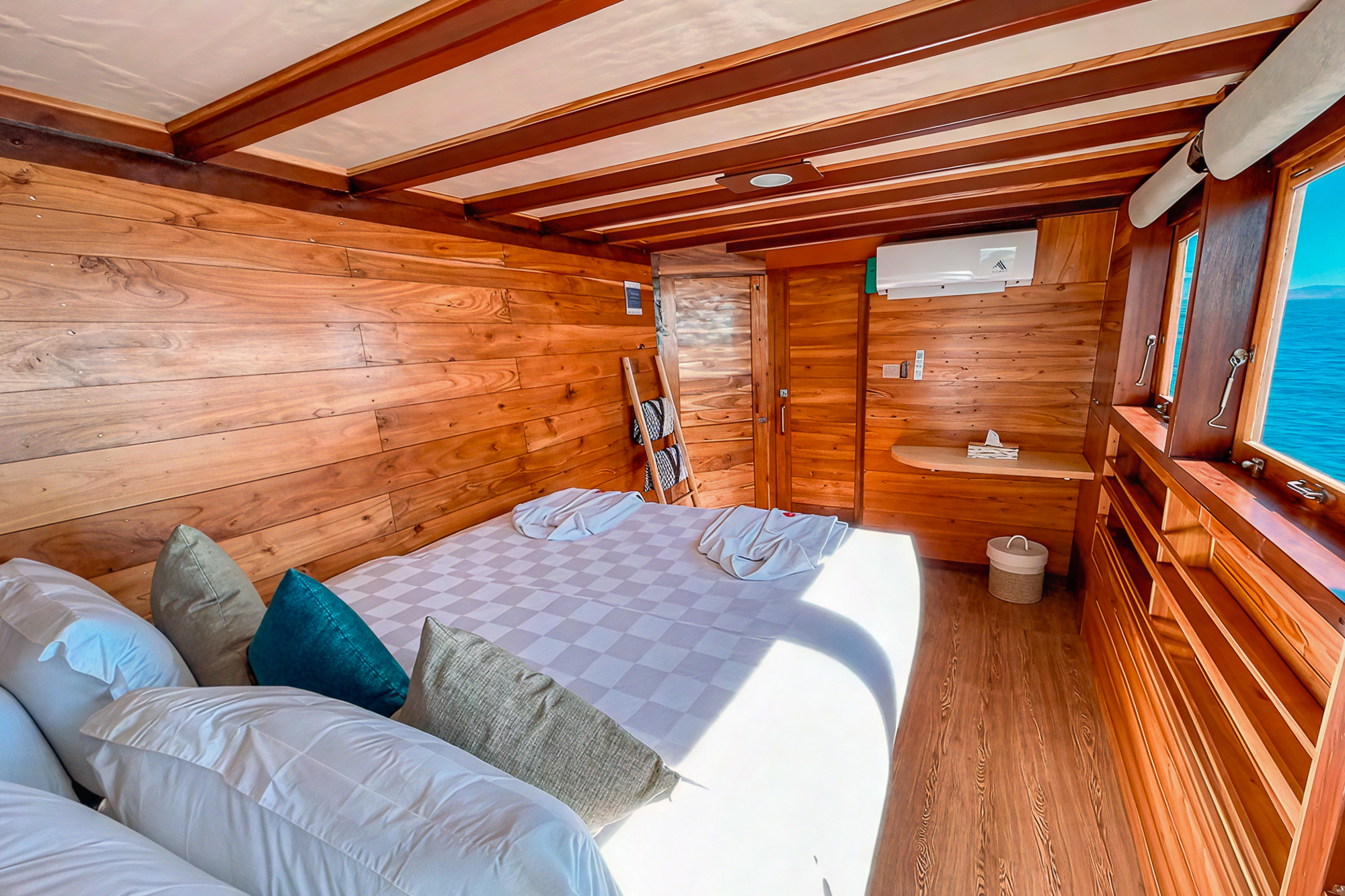 Vinca Voyages stands out for its thoughtful balance of comfort, culture, and adventure. Built as a 31 meter traditional wooden ship, it accommodates up to 18 guests across six individually designed cabins. Each room reflects a different cultural style—Western, Japanese, or Balinese—giving guests a uniquely personal touch during their stay.